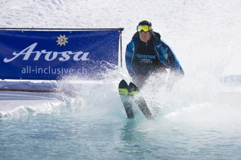 Ein grosses Spektakel bot am Nachmittag der abschliessende Waterslide Contest. Mehr oder weniger elegant glitten die Teilnehmer auf Skis über ein Wasserbecken und manch einer beendete diese Disziplin platschnass. Für den abenteuerlichsten Wasser-Ritt wurde Urs Lehmann mit dem Disziplinsieg belohnt.