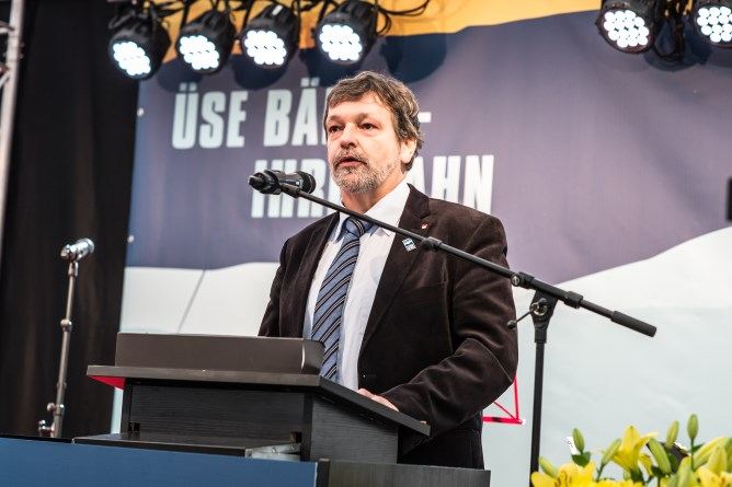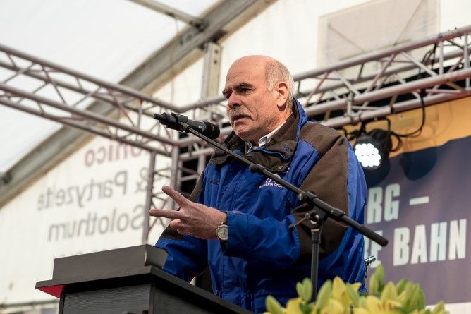 Zahlreiche Redner machten Zahlenspiele zur Bahn. So auch der Bauverantwortliche Johannes Sutter der erklärte, dass 8 Jahre gestritten, 8 Monaten geplant und 8 Monaten gebaut wurde damit man nun in rund 8 Minuten von Oberdorf auf den Weissenstein fahren könne.