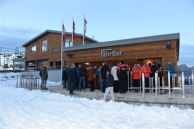 Die 120 geladenen Gäste wurden an der Eröffnungsfeier des neuen Bergrestaurants Prodalp in Flumserberg in der «Fahrbar» mit Musik begrüsst. Der Innenraum ist mit Holzflächen in Kombination mit Sichtbetonwänden verarbeitetet, in welchen speziell konstruierte Rahmen diverse Bilder aus vergangenen Jahren kunstvoll präsentieren.