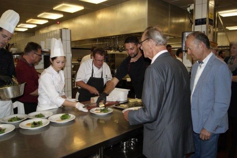 Beim Anblick des Menüs und der Weinauswahl war der Abend so richtig lanciert und die Vorfreude gross. Die Gäste sollten nicht enttäuscht werden: Rolf Kallmann vom Restaurant Hirschen im deutschen Bad Bellingen eröffnete den Abend und das Menü mit dem ersten Gang. Von ihm erfuhren die Gäste, dass er vor über 35 Jahren in Süddeutschland die Idee des «Kitchen-Dinners» ins Leben gerufen hatte und damit europaweit die Gäste verblüfft. Es sei ihm eine Ehre und ein Vergnügen, seinen ehemaligen Lehrling Carsten Witzke bei der Neulancierung dieser Idee mit den anderen Gastköchen zu unterstützen. Für das Wohl kulinarische Wohl der Gäste sorgten neben Rolf Kallmann und Carsten Witzke auch Manuel Mähler, Souschef, Ramada Hotel Regina Titlis Engelberg, Michael Föry, Küchenchef im Ramada Hotel Solothurn, Ulf Braunert vom Restaurant Hess by Braunert's in Engelberg und Thomas Christen von der Bäckerei-Konditorei Christen in Stans, Stansstad, Beckenried, Buochs, Engelberg, Hergiswil.