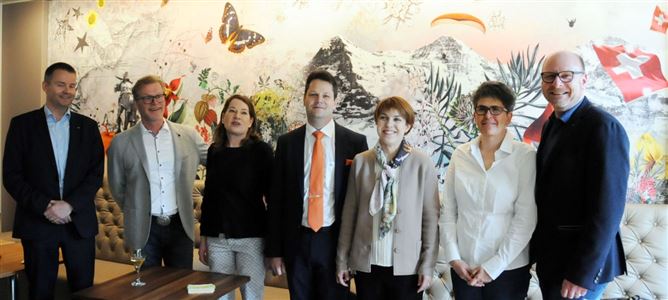 Elisabeth Hofmann freute sich insbesondere über die gelungene neue Tapete im Restaurant Stellaambiente. Dort schuf das namhafte Textilunternehmen Jakob Schläpfer ein farbenfrohes Unikat. «Ich bin gelernte Damenschneiderin und mein Herz schlägt seit da beim Namen Jakob Schläpfer immer etwas höher», so die stolze Gastgeberin. Die Tapete zeigt typische Elemente aus Interlaken, wie das Dreigestirn Eiger, Mönch und Jungfrau, Blumen, Jodler, Fahnenschwinger, eine Kuh und Gleitschirmflieger sowie Wasser.