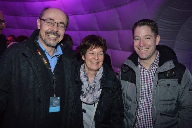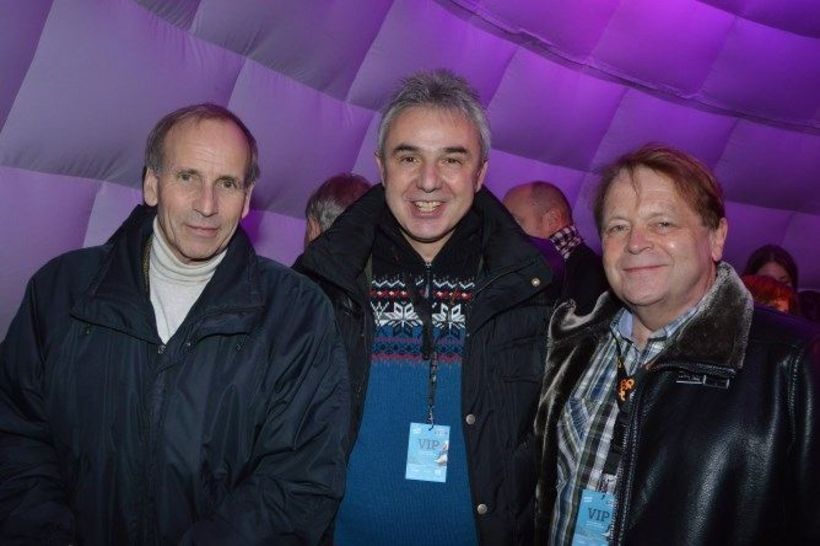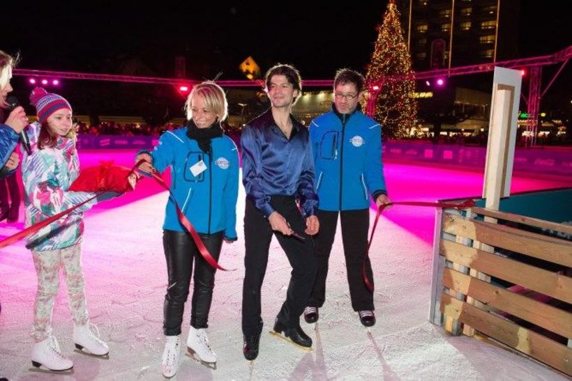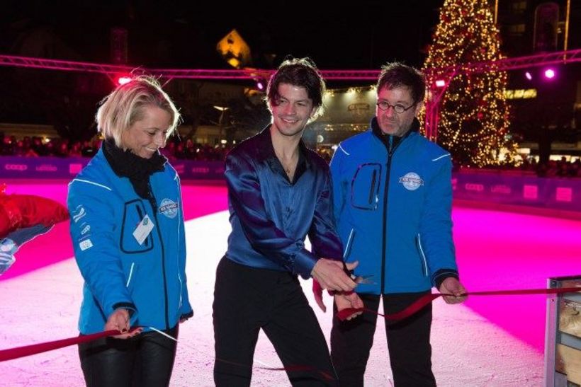 Unter grossem Beifall durchschnitten Olympiasieger Lambiel, Stefan Otz, Interlakner Tourismusdirektor und Präsident des Vereins Chance Winter, mit Iris Huggler, Geschäftsführerin der Jungfrau World Events GmbH, das rote Band, um die Eiswege und restlichen Eisfelder einzuweihen.