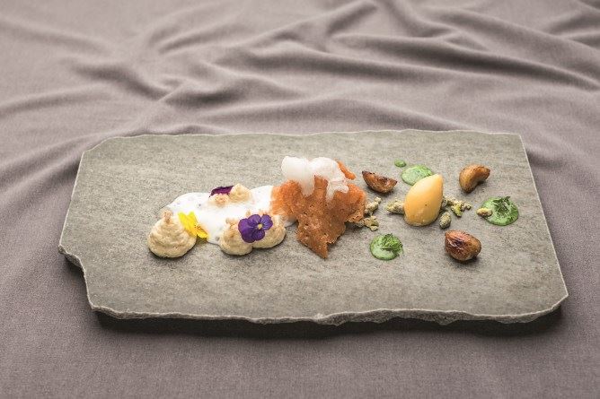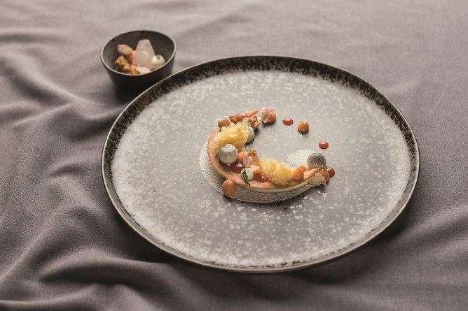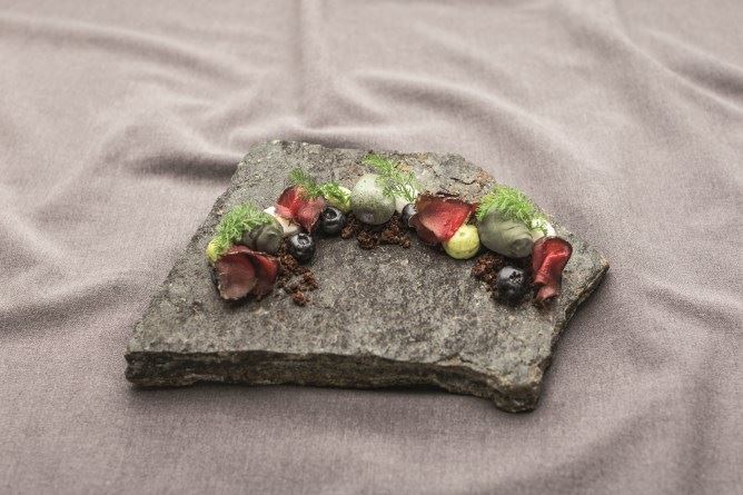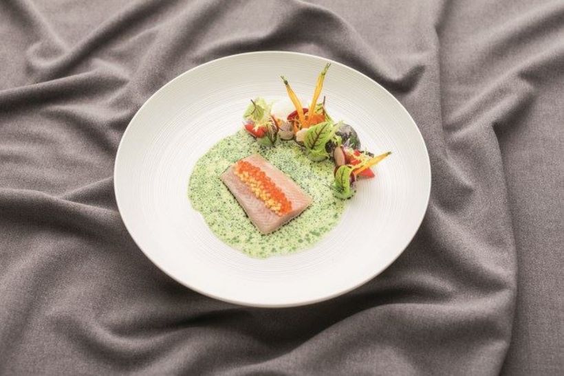 Mit der Vorspeise «Bergforelle – Dill – Gemüse-Pickles»erzielte Dominik Sato vom Restaurant Cheval Blanc byPeter Knogl im Grand Hotel Les Trois Rois in Basel dieBestnote der Jury und schaffte es auf den 1. Platz.