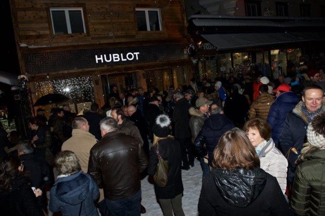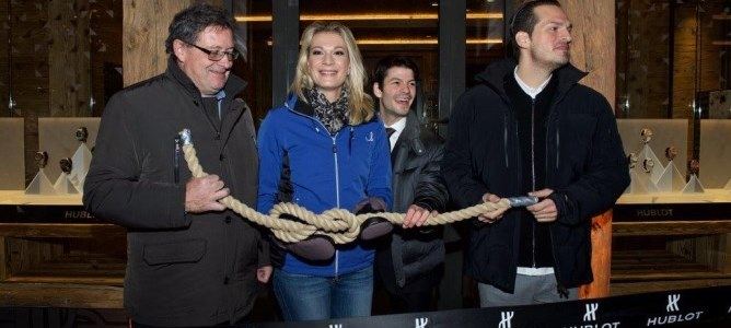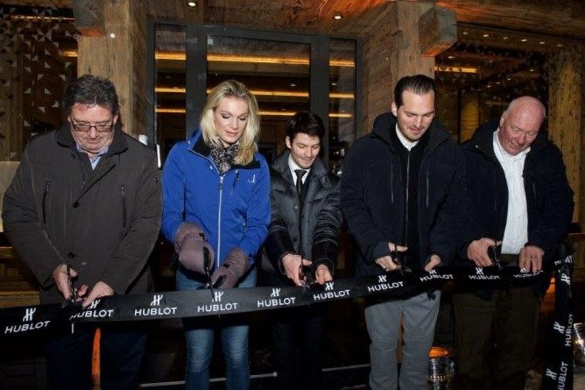 Bei der Eröffnung im verschneiten Zermatt auf 1608m Höhe wurde am Samstag das traditionelle Band, das bei Einweihung zerschnitten wird, durch ein Bergseil ersetzt. Statt es zu zerschneiden, knoteten Jean-Claude Biver, CEO des Geschäftsbereichs Uhren der Gruppe LVMH und Chairman von Hublot sowie Christoph Bürgin, Präsident von Zermatt, mit den Botschaftern der Marke Maria Höfl-Riesch, Stéphane Lambiel und DJ Teddy-O einen Achterknoten. Das ist der nützlichste und sicherste Knoten beim Bergsteigen.