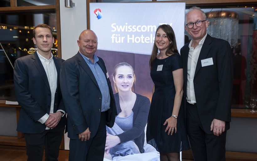 Das Swisscom-Team (v.l.): Daniel Mermer, Claude Graf, Barbara Garcia, Markus Wittig. Das Swisscom-Team (v.l.): Daniel Mermer, Claude Graf, Barbara Garcia, Markus Wittig. Bild: htr hotel revue / Miriam Schwarz
