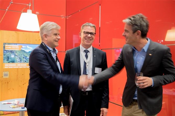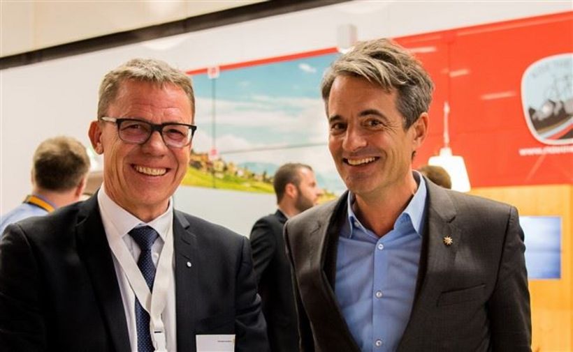 Unter dem Motto «Die Natur will dich zurück – auf dem Velo» nahm Martin Nydegger, bei seinem ersten Auftritt in Berlin als ST-Direktor, die Gäste mit auf die Reise durch das Veloland Schweiz. Andreas Züllig, Präsident von hotelleriesuisse, zeigte die schönsten Etappenziele der Schweizer Hotellerie.