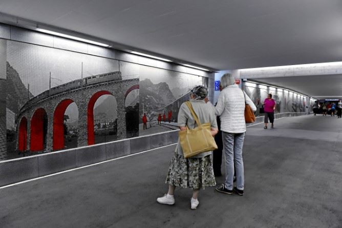 So wurde einerseits als Verbindungselement zwischen Bahnhof, Busterminal und Dorfzentrum aus originalen alten Bahnschienen ein spezieller Aufenthalts- und Informationsplatz zum Welterbe geschaffen. Andererseits wurde die rund 75 Meter lange Unterführung vom Bahnhof zum St. Moritzersee auf beiden Seiten mit Mosaikbildern, bestehend aus insgesamt 2,2 Millionen Glaskeramikplatten ausgekleidet. Dies bezugnehmend auf die Unterführung aus dem Jahr 1909, welche ebenfalls mit Glaskeramikplatten ausgekleidet war. (htr/og)