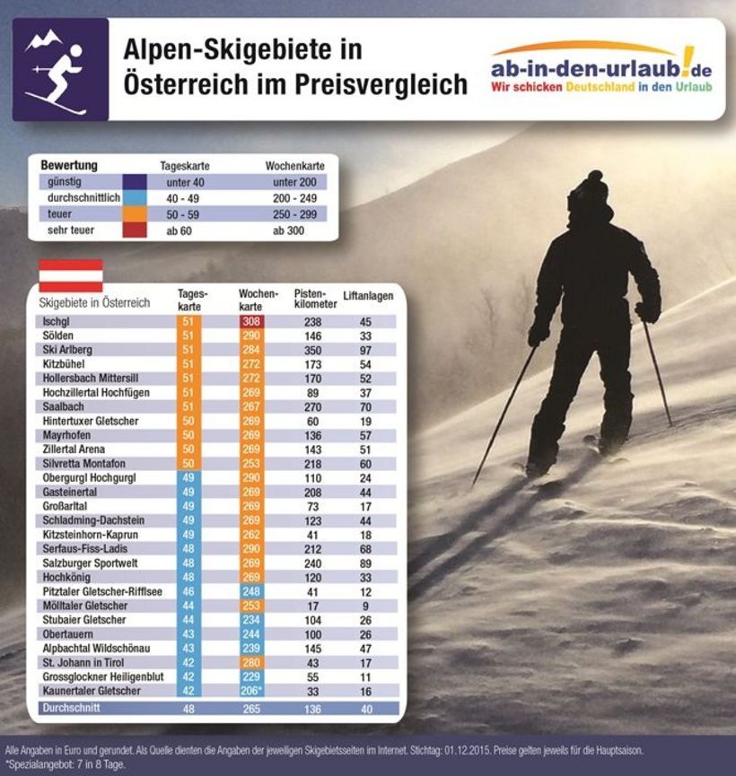 In Österreich gibt es zwischen den einzelnen Skigebieten keine grossen Preisunterschiede. So kostet in den Skigebieten Ischgl, Sölden, Ski Arlberg, Kitzbühel, Hollersbach Mittersill, Hochzillertal Hochfügen sowie Saalbach die Tageskarte gleichermassen 51 Euro. Unterschiede gibt es lediglich bei den Wochenkarten. In Ischgl muss der Wintersportler für sieben Tage Pistenspass 308 Euro hinblättern, was den Höchstwert in Österreich darstellt. 35 Euro günstiger ist die Wochenkarte hingegen in Kitzbühel (272 Euro). Für die Skipass-Wochenkarte in Sölden müssen Ski- und Snowboardfahrer 290 Euro bezahlen.