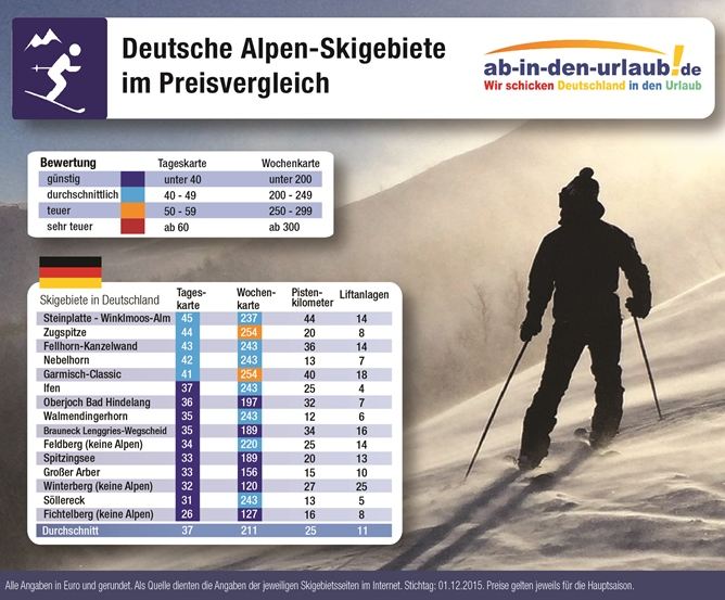 In den Alpen kostet eine Skipass-Tageskarte durchschnittlich 47 Euro pro Person, die Wochenkarte 263 Euro. Viel Pistengaudi für ihr Geld können Wintersportbegeisterte in Deutschland bekommen. Das teuerste in der Studie erfasste deutschen Skigebiet Steinplatte – Winklmoos-Alm ist mit 45 Euro (Tageskarte) und 237 Euro (Wochenkarte) im Alpenvergleich günstig. Die Liftanlagen rund um die Zugspitze können für 44 Euro (Tageskarte) und 254 Euro (Wochenkarte) benutzt werden, die am Nebelhorn für 42 Euro (Tageskarte) und 243 (Wochenkarte).