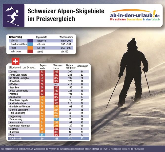 Die acht teuersten Alpen-Skigebiete liegen in der Schweiz. Auf Platz 1 findet sich, wie bereits in den Vorjahren, Zermatt. Um einen Tag lang die insgesamt 54 Skianlagen vor Ort benutzen zu können, bedarf es umgerechnet 73 Euro. Eine Wochenkarte kostet 395 Euro. Auf Rang 2 liegt Flims Laax Falera (Tageskarte 70 Euro, Wochenkarte 369 Euro). Platz 3 sichert sich das exklusive St. Moritz Corviglia (Tageskarte 69 Euro, Wochenkarte 377 Euro).
