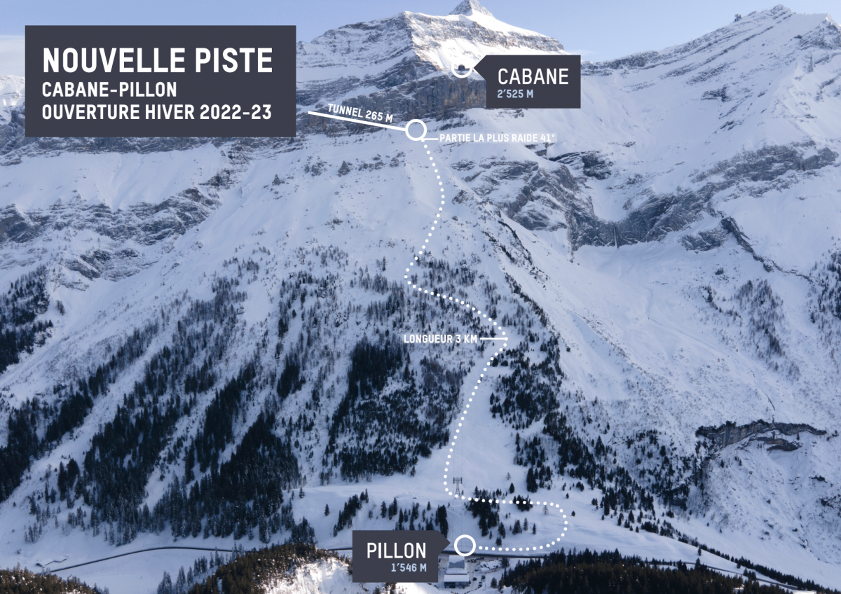 Während der letzten 20 Jahre diente die Seilbahn zwischen dem Col du Pillon und der Mittelstation Cabane als Transportmittel für Skifahrerinnen und -fahrer, sowohl für den Aufstieg als auch für die Abfahrt. Dank des Baus eines Tunnels bedient die Anlage nun eine schwarze Piste und eine Skiroute. Der Tunnel ist 265 Meter lang, 2,50 Meter breit und 3 Meter hoch, hat ein Gefälle von 14 Prozent und ist mit einem Indoor-Skiteppich ausgestattet, auf dem die Skifahrerinnen und -fahrer die Felswand in weniger als einer Minute überwinden können. «So ist es nun möglich, mit Skiern vom Gipfel auf über 3’000 Meter bis zum Parkplatz Col du Pillon, der Talstation des Skigebiets, hinunterzufahren», wird der Direktor in der Medienmitteilung zitiert.