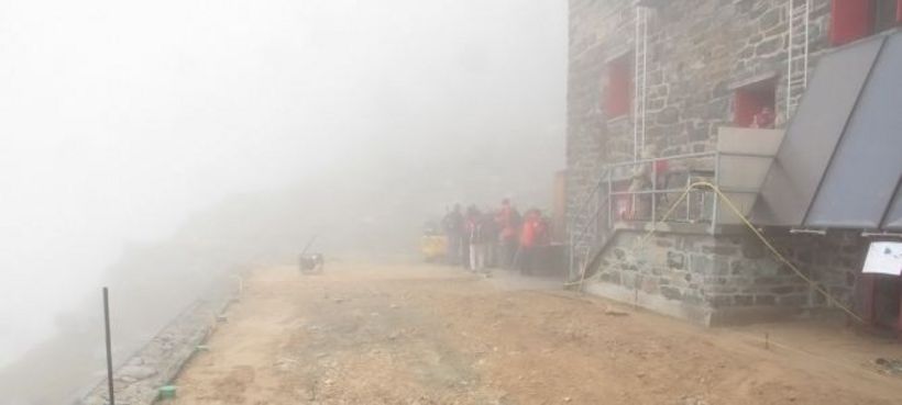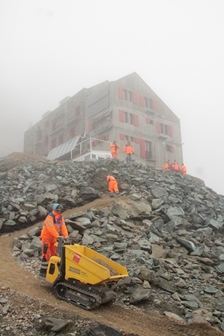 Insgesamt 65 Lernende der Frutiger Gruppe erweiterten und sanierten die Terrasse der Hütte des Schweizer Alpen Clubs. Maurer, Elektriker, Metallbauer und viele andere Lernende des Bauunternehmens arbeiteten in vier Gruppen jeweils eine Woche lang hoch oben in den Saaser Bergen. Die grösste Herausforderung war für Mechaniker Simon Wandfluh schnell gefunden: «Die Bauhöhe auf 3030 Meter und der damit verbundene logistische Aufwand.» Zwar konnte das Material zur Bodenplanierung der direkten Umgebung entnommen werden. Alle Geräte und das restliche Material mussten aber in mühsamer Arbeit zuerst zur Hütte gebracht werden. Auf den Berg erfolgte der Transport mit der Felskinnbahn. Von dort aus flog der Helikopter die Fracht weiter zum Arbeitsplatz. Wertvolle Unterstützung erhielten die Lernenden dabei von der Saastal Bergbahnen AG.