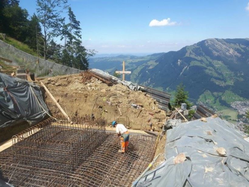 Nachdem die letzten Abbrucharbeiten im Kräbel erfolgt waren, konnte mit dem Aushub begonnen werden. Im Kräbel zeigten sich jedoch mehr Felspartien, als die getätigten Sondierbohrungen ergaben. Nachdem diese mit einigen Sprengungen entfernt waren, konnten die Hangsicherungen gegenüber den Rigi Bahnen ausgeführt werden. Somit sei ein reibungsloser Betrieb der Rigi Bahnen auch während der Bauzeit gewährleistet. In den kommenden Wochen wird die benötigte Bodenplatte betoniert, auf welcher die Steher zu stehen kommen.