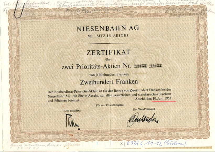 Wegen einer Gesetzesänderung müssen alle nicht börsenkotierten Aktiengesellschaften ihre Inhaberaktien bis am 1. Mai 2021 in Namenaktien umwandeln. Die Aktienträgerinnen und -träger der Niesenbahn AG wurden an der letzten Generalversammlung vom 18. August 2020 über das Vorhaben orientiert.