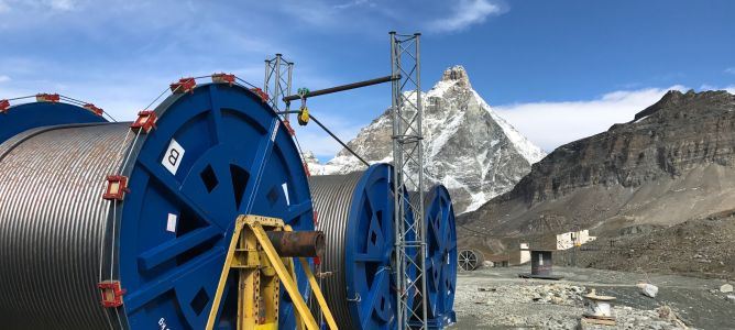 Insgesamt mussten die Seile über 5500 Meter weit transportiert werden und eine Höhendifferenz von knapp 1000 Höhenmeter überwinden. Ein (Draht-)Seilakt im wahrsten Sinne des Wortes.Endlich an ihrem Bestimmungsort auf Trockener Steg angekommen, wurden die Seile wieder auf Seilbobinen aufgerollt und warten nun dort auf die eigentliche Seilmontage auf der neuen 3S-Bahn. Dieser soll bereits Anfangs November stattfinden.