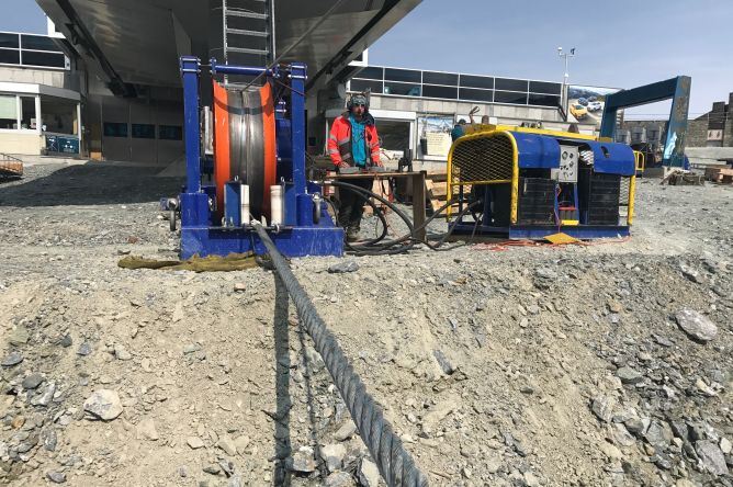Von Laghi Cime Bianche aus sollten die neuen Seile via Furggsattel dann nach Trockener Steg gezogen werden. Damit die neuen Seile jedoch überhaupt auf Reise gehen konnten, mussten in den vergangenen Wochen einige Installationen vorgenommen werden. So wurde eine provisorische Seilbrücke, abgestützt auf vier temporären Stützen montiert um das Vorseil zu ziehen. Das viel weniger schwere Vorseil konnte von der italienischen Seite aus mit dem Helikopter auf den Furggsattel transportiert und von da mit einem Hilfslaufwerk via der Seilbrücke nach Laghi Cime Bianche gezogen werden.