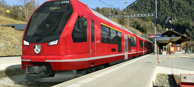 | Die neuen Flügeltriebzüge der RhB Für insgesamt 361 Millionen Schweizer Franken hat die RhB 2016 insgesamt 36 vierteilige Flügeltriebzüge bei Stadler Rail bestellt. Es handelt sich dabei um die grösste Rollmaterialbeschaffung in der Geschichte der RhB. Die Fahrzeuge werden künftig auf den Strecken Chur – Disentis, Landquart – Scuol/Davos/St.Moritz, Scuol - Pontresina und Davos - Filisur eingesetzt. Die Bezeichnung Flügeltriebzüge kommt daher, dass zwei solcher Triebzüge gemeinsam beispielsweise von Landquart nach Klosters Platz fahren können, sich dort automatisch teilen, wobei ein Teil nach Davos und der andere in Richtung Engadin weiterfährt. Die RhB kann damit künftig ihre Produktivität erhöhen. Weitere Informationen zu den neuen Zügen: www.rhb.ch/fluegeltriebzuege. |