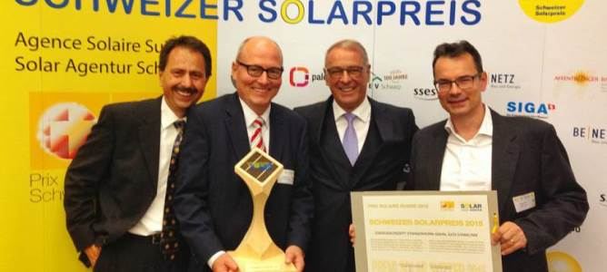 Die Solar Agentur Schweiz überreichte am vergangenen Dienstag anlässlich der 25. Solarpreisverleihung in Genf den Solarpreis 2015 an Jürg Balsiger, Direktor der Stanserhorn-Bahn. Mit dabei waren Daniel Marti und Erich Zahnd von der Energieberatungsfirma ee3 GmbH, die dem Unternehmen beratend zur Seite standen.