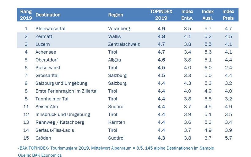 Das Ranking führt Kleinwalsertal im Vorarlberg vor Zermatt und Luzern an. Die Ränge vier bis fünfzehn werden allesamt von österreichischen, deutschen und italienischen Destinationen belegt.