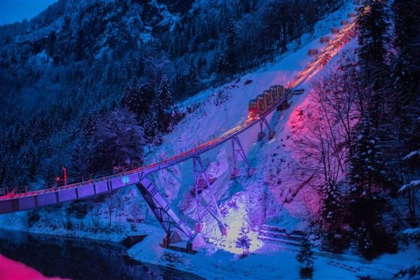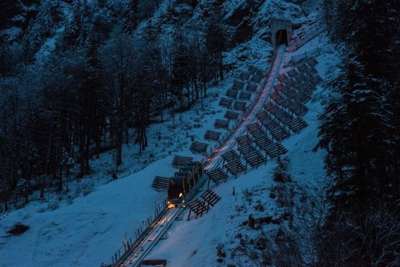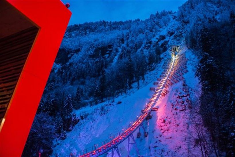 Von 562 Metern über Meer geht es hoch auf 1306 Meter. 136 Personen passen in einen Wagen, die Scheiben beschlagen. Die klassische Standseilbahn mit zwei Wagen, die sich in der Mitte kreuzen, weist eine Neigung von bis zu 110 Prozent auf. Trotzdem stehen die Passagiere durch den automatischen Niveauausgleich immer waagrecht.