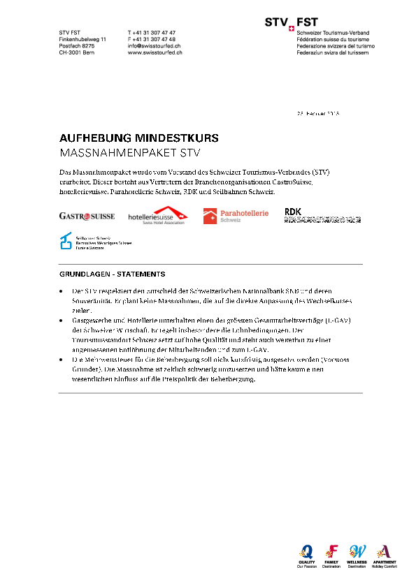 Zu den definierten Massnahmen gehören unter anderem die Unterstützung und geforderte Anpassung der Standortförderungs-Instrumente (Mittel an Schweiz Tourismus, Innotour, Verlängerung, Verlängerung des SGH-Kredits und neue Regionalpolitik) an die Situation nach der Aufhebung des Mindestkurses.