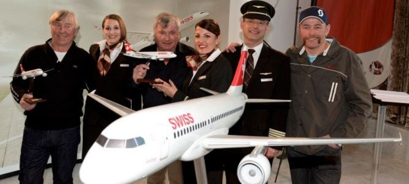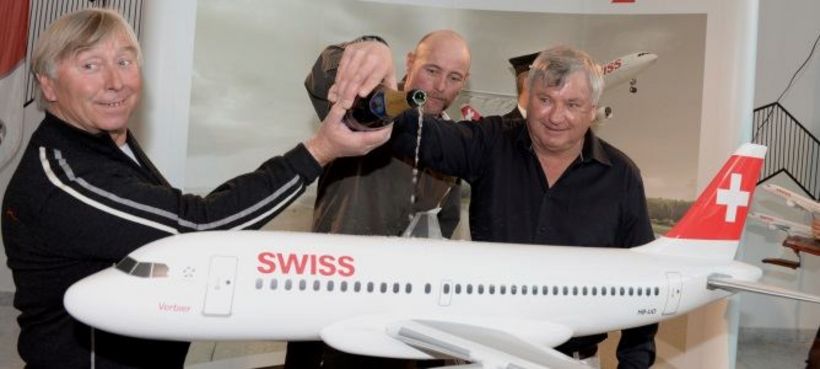 Als Taufpaten für das Flugzeug «Verbier» waren die Schweizer Ski-Grössen Roland Collombin, Philippe Roux und William Besse anwesend.