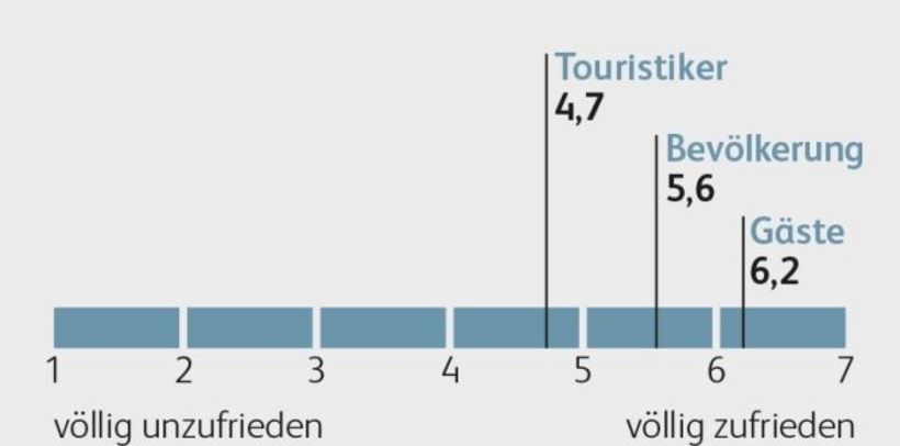 Die Studie zeigte aber auch, dass der Umgang mit Gästen nicht so schlecht ist wie oft dargestellt wird. Auf einer Skala von 1 (völlig unzufrieden) bis 7 (völlig zufrieden) benoteten die Gäste die Gastfreundschaft mit 6,2. Die Touristiker selbst gaben der gebotenen Gastfreundschaft selbstkritisch nur die Note 4,7. Die Einschätzung der Einheimischen bezüglich der Gastfreundschaft lag bei 5,6 (siehe Grafik hier)