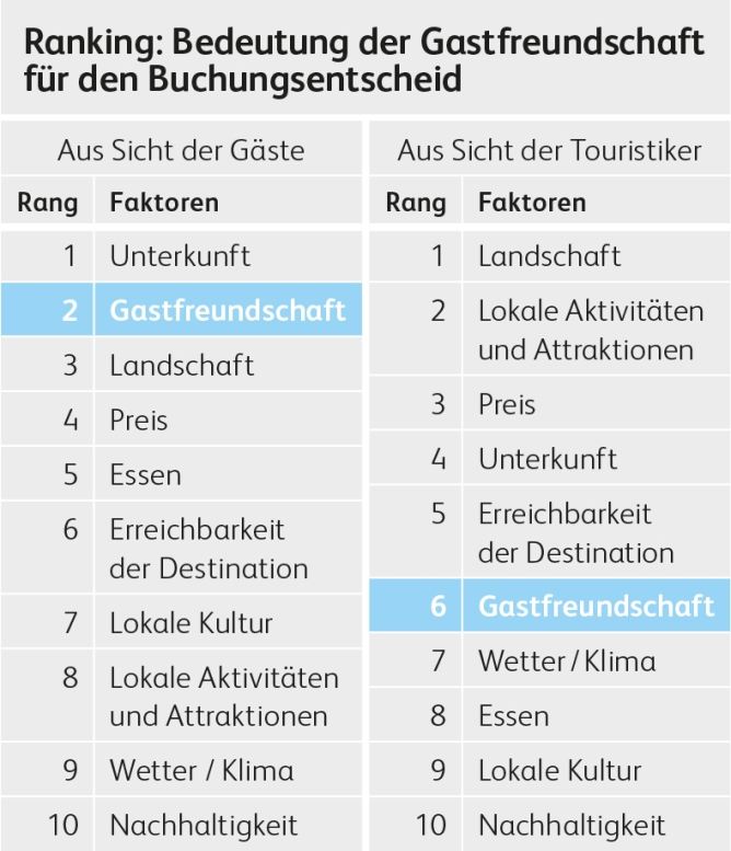 Einen tieferen Stellenwert hat die Gastfreundschaft bei denen, die sie anbieten müssen. Nur 26 Prozent der Touristiker hätten sie unter die drei wichtigsten Faktoren gesetzt, teilte die Hochschule mit. Aus ihrer Sicht seien die Landschaft und die lokalen Attraktionen wichtiger als die Gastfreundschaft.