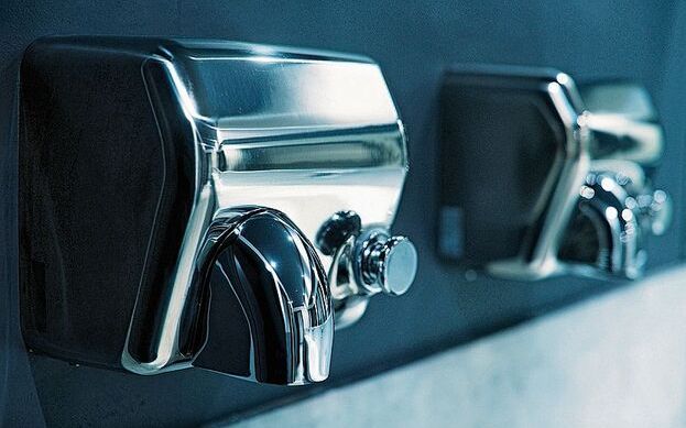 Vor etwas mehr als 100 Jahren, im Juni 1922, meldete die Airdry Corporation aus New York den weltweit ersten Händetrockner zum Patent an. Heute gibt es kaum eine öffentliche Toilette, die nicht mit einem solchen Gerät ausgestattet ist. Aus technischer Sicht lassen sich zwei Typen unterscheiden: Warmluft-Händetrockner und Hochgeschwindigkeits-Händetrockner. Die klassische Variante sind jene mit einem Warmluftgebläse. Sie erzeugen warme Luft durch einen elektrischen Widerstand von mehr als 2300 Watt, was mit einem entsprechend hohen Energieverbrauch verbunden ist. 30 Sekunden dauert es, bis die Hände trocken sind – dafür benötigen Warmluft-Händetrockner rund 20 Wh.